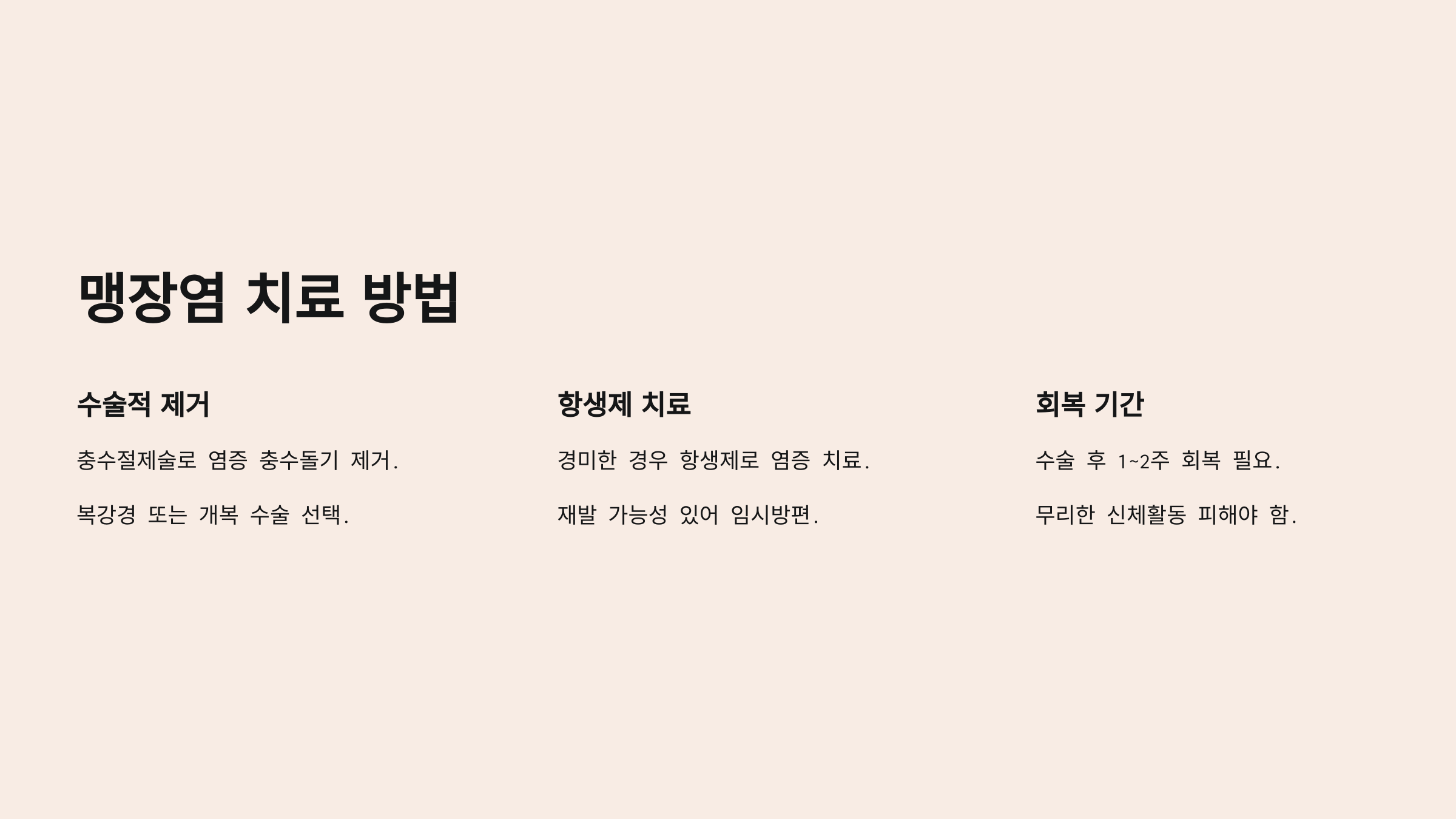 맹장염은 신속한 치료가 중요한 질환입니다. 다음은 대표적인 치료 방법입니다: