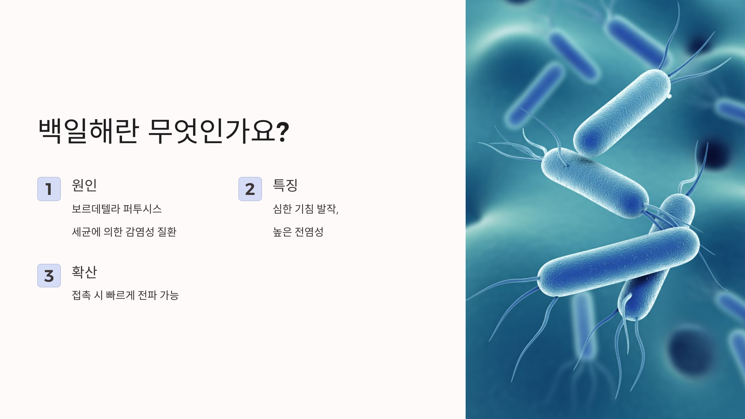 백일해는 보르데텔라 퍼투시스(Bordetella pertussis)라는 세균에 의해 발생하는 감염성 질환으로, 심한 기침 발작이 특징입니다. 특히 전염성이 높아 접촉 시 빠르게 확산될 수 있습니다.