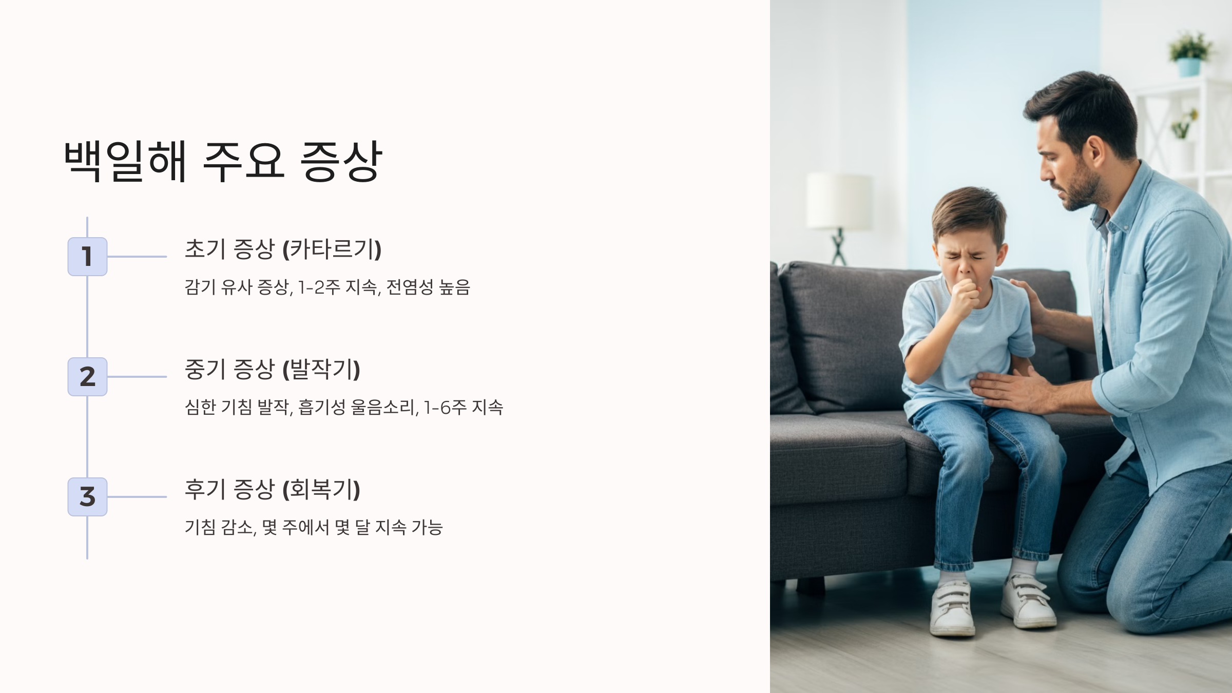 백일해는 병의 진행 단계에 따라 증상이 다르게 나타납니다.