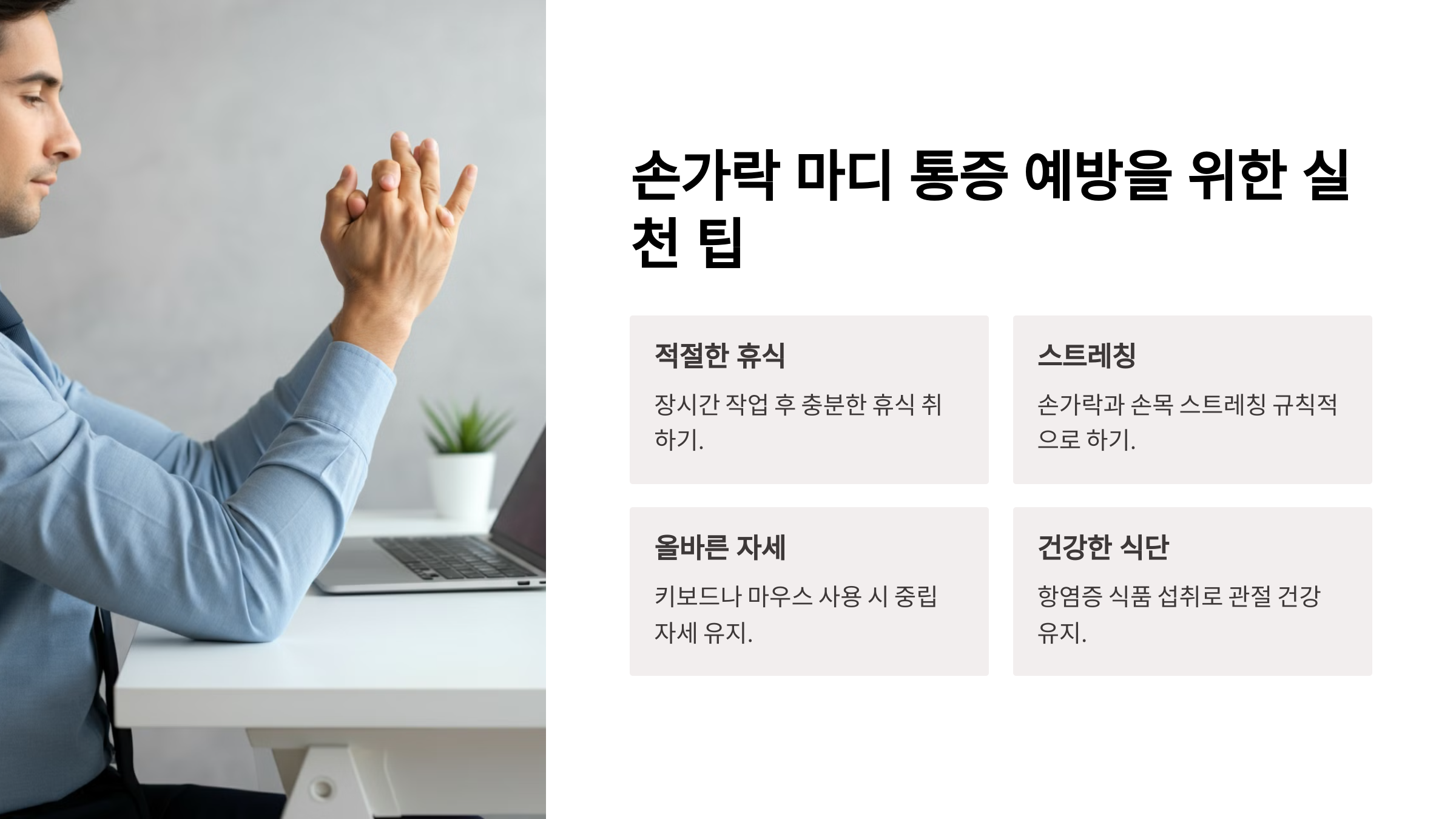 - 스트레칭: 손가락과 손목을 부드럽게 펴고 구부리는 운동을 규칙적으로 합니다.