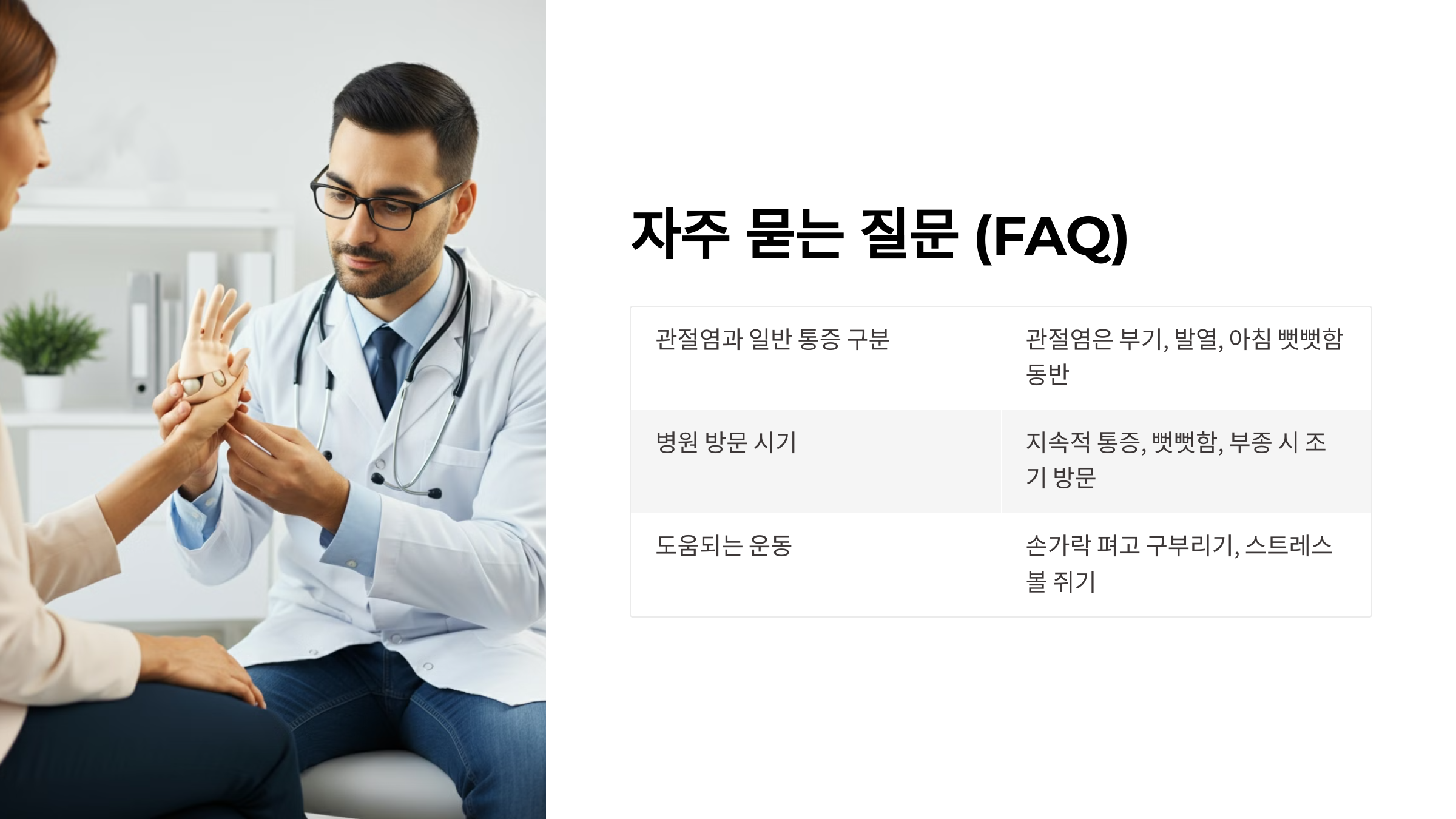 A2. 통증이 지속되거나 관절이 뻣뻣하고 부어오른다면 조기에 병원을 방문해 정확한 진단을 받는 것이 중요합니다.