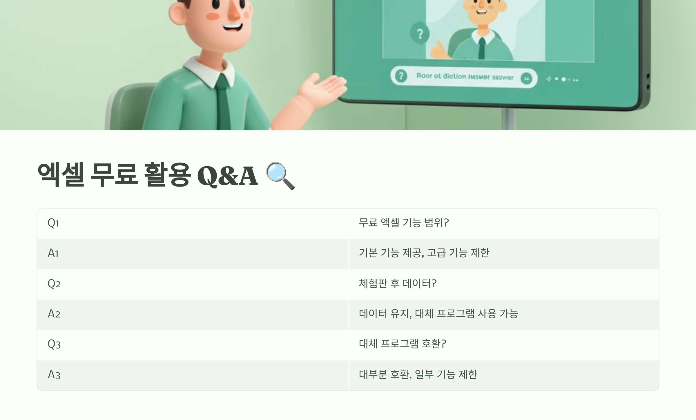 엑셀은 강력한 기능을 가진 소프트웨어지만, 비용 부담이 클 수 있습니다. 다행히도 위에서 소개한 웹용 엑셀, 체험판, 대체 프로그램을 활용하면 충분히 무료로 사용할 수 있습니다.