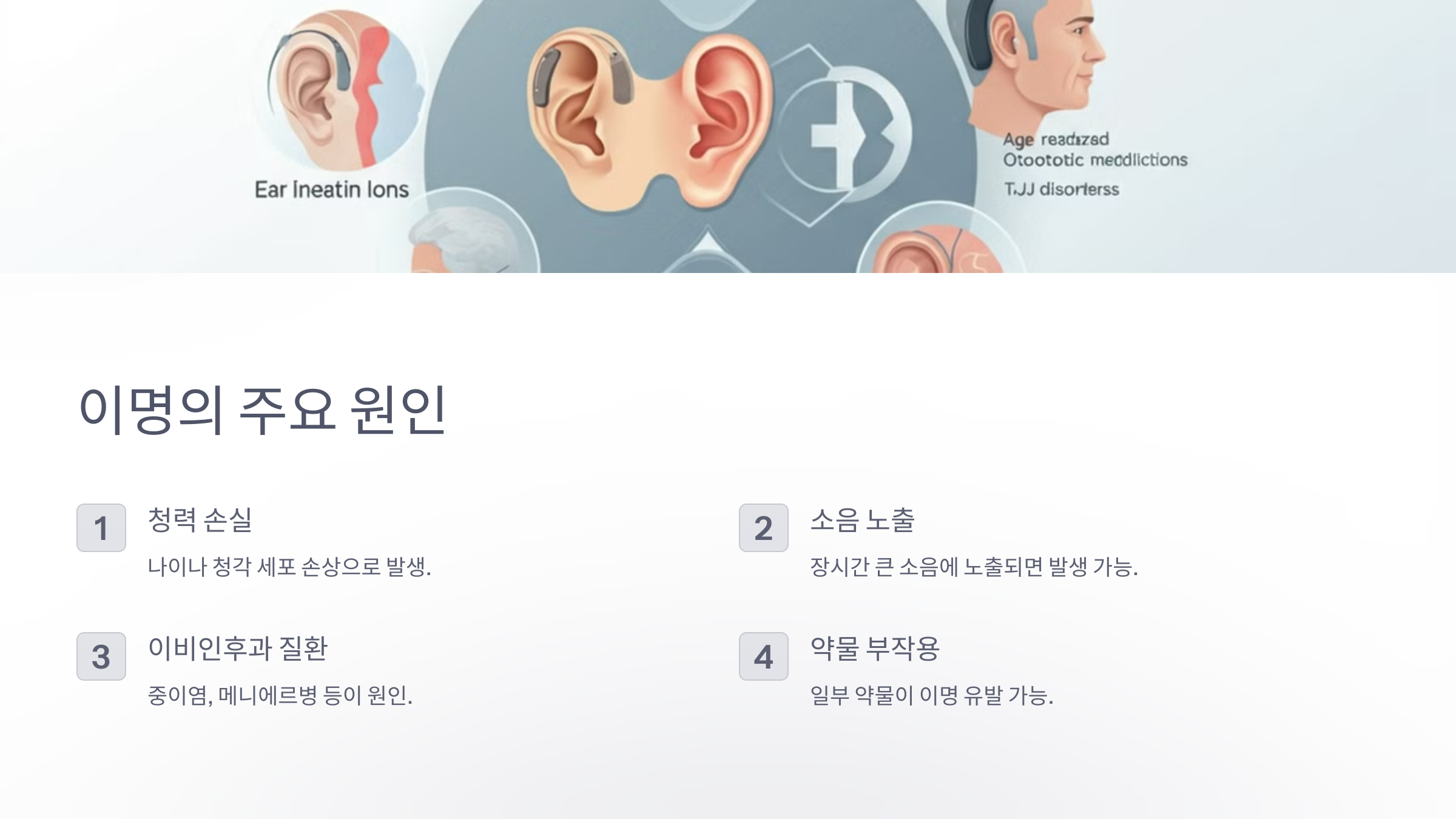이명의 원인은 다양하며, 주요 원인은 다음과 같습니다: