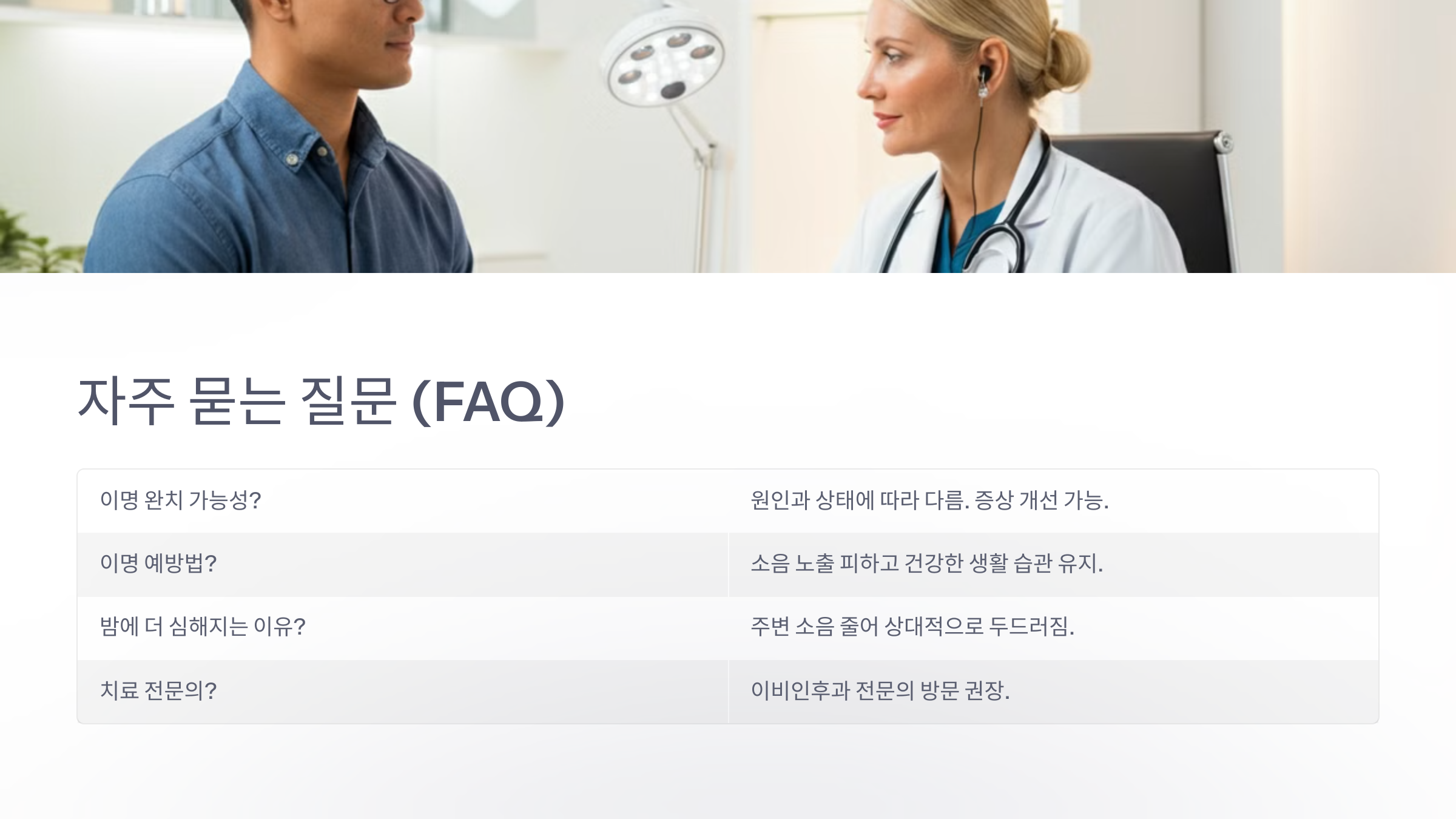 A3. 밤에는 주변 소음이 줄어들어 이명이 상대적으로 더 두드러지게 느껴질 수 있습니다.