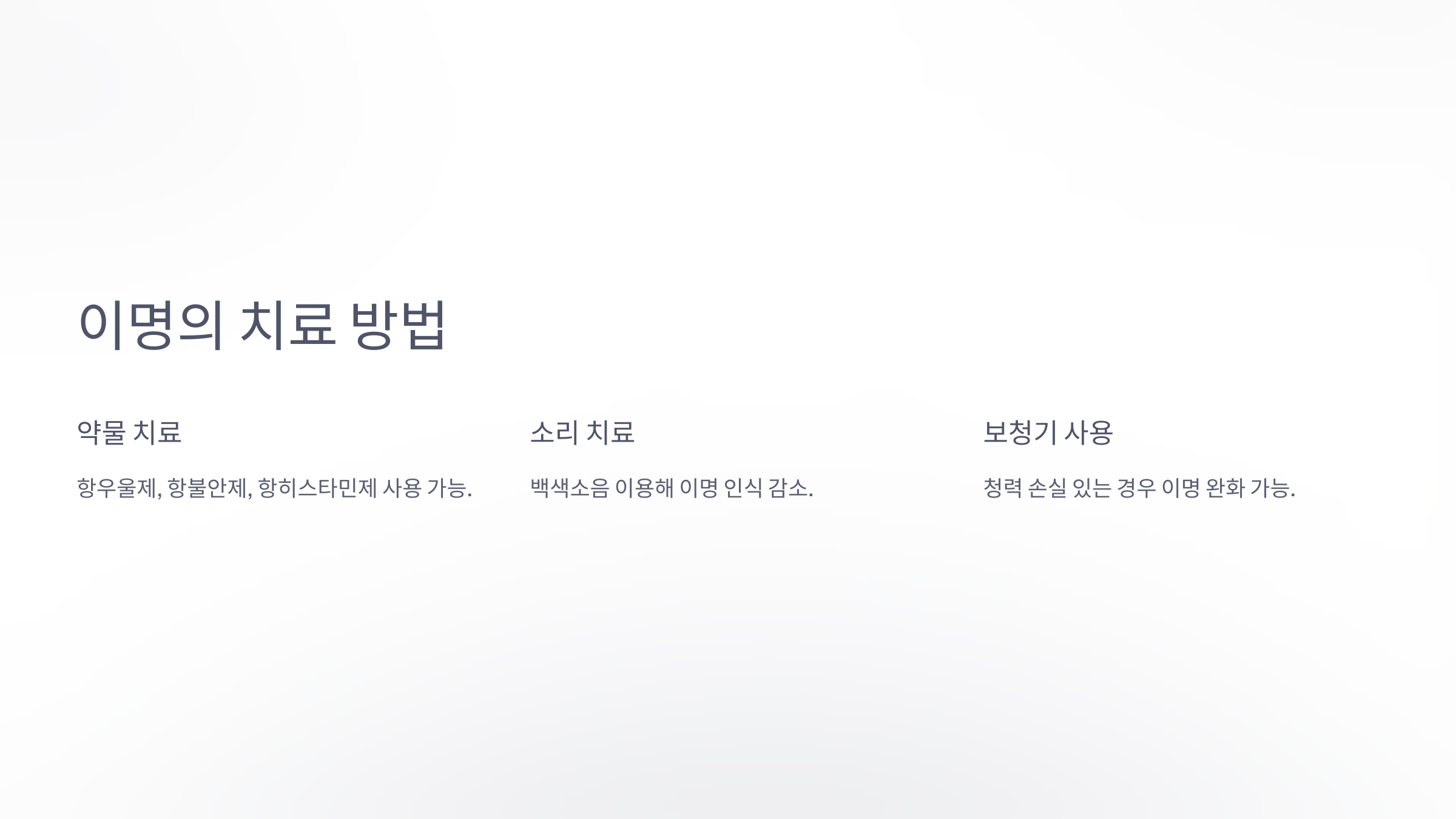 - 주변 소음을 활용하거나 백색소음을 이용하여 이명 소리를 덜 인식하게 합니다.