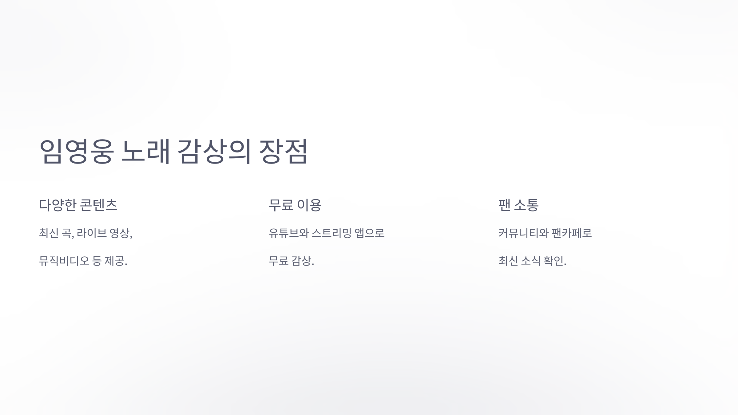 - 다양한 콘텐츠: 최신 곡, 라이브 영상, 뮤직비디오 등 다양한 형식으로 감상 가능