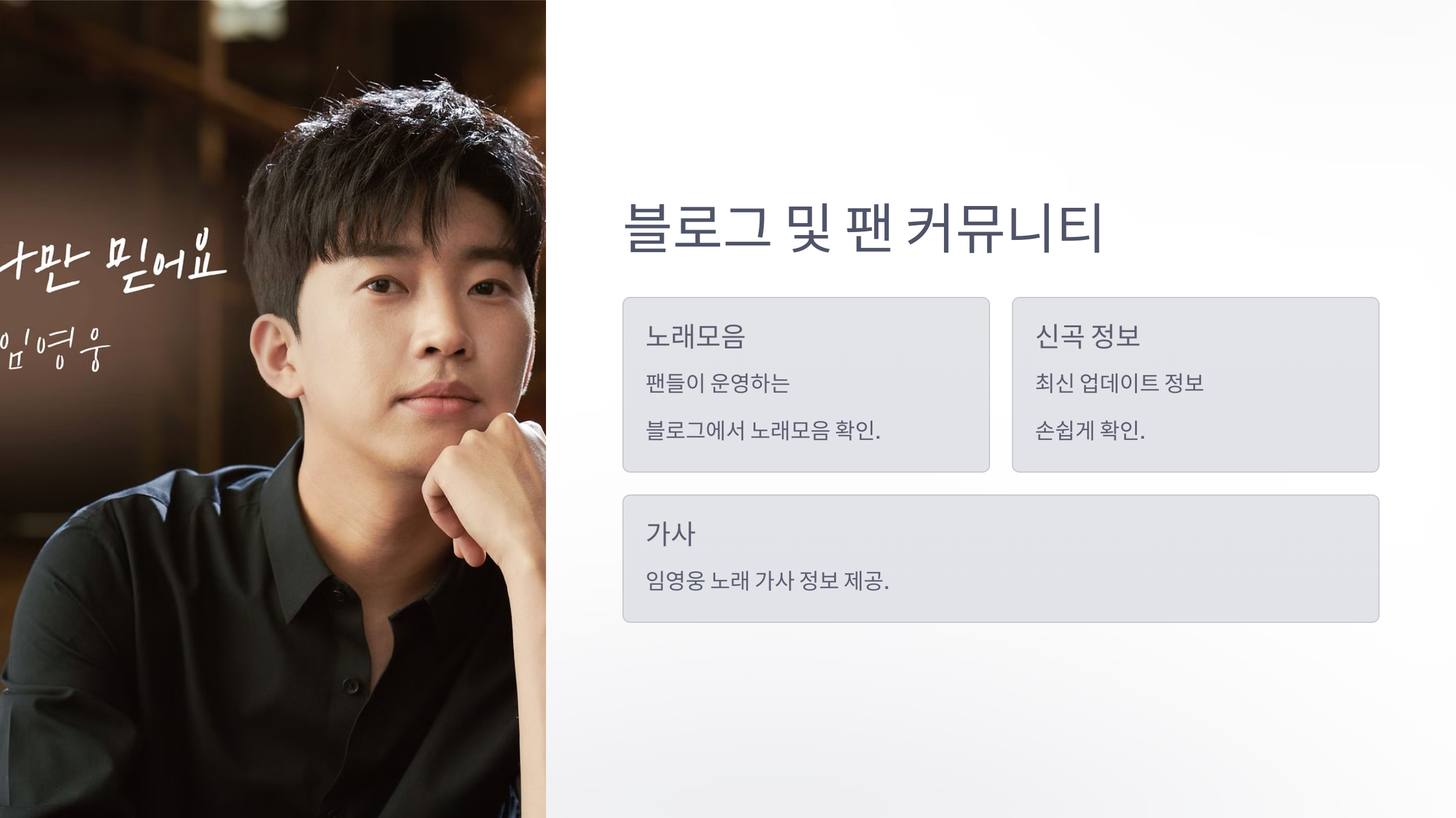 임영웅 팬들이 운영하는 블로그와 커뮤니티에서는 노래모음, 신곡 업데이트 정보, 가사 등을 손쉽게 확인할 수 있습니다.