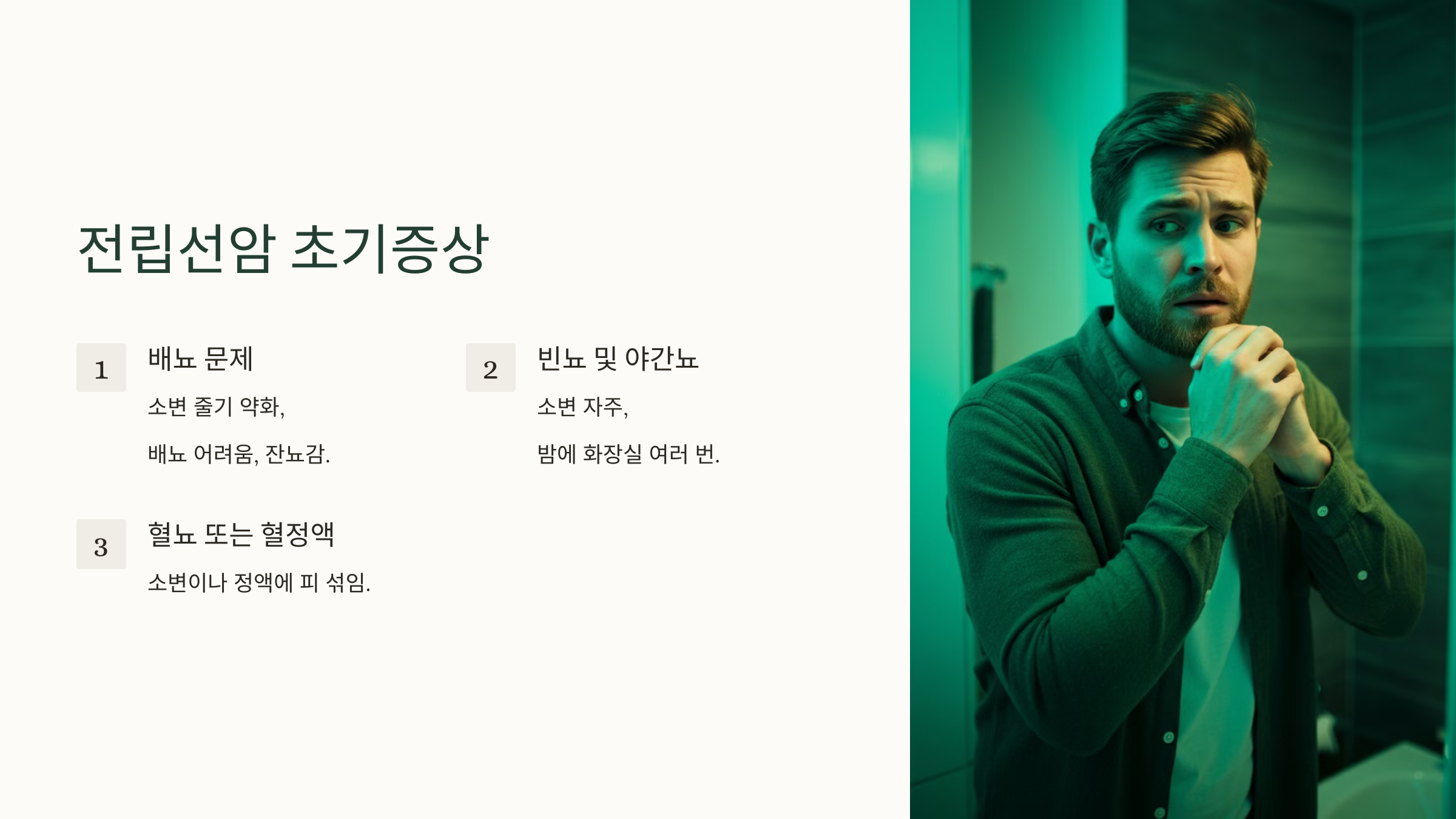 소변 줄기가 약해지거나 배뇨 시작이 어려워지고, 잔뇨감이 느껴질 수 있습니다. - 빈뇨 및 야간뇨