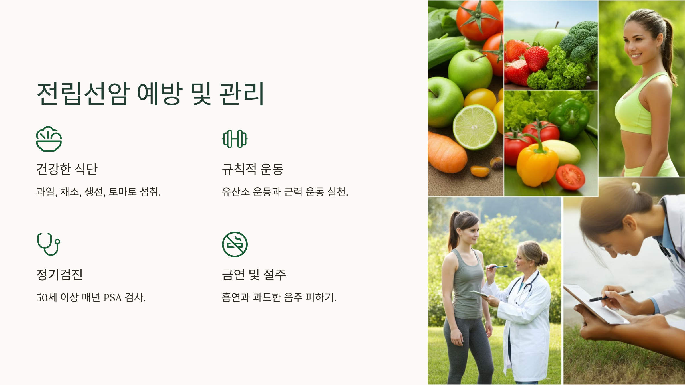 - 유산소 운동과 근력 운동은 전립선암 예방과 전반적인 건강 유지에 도움을 줍니다.