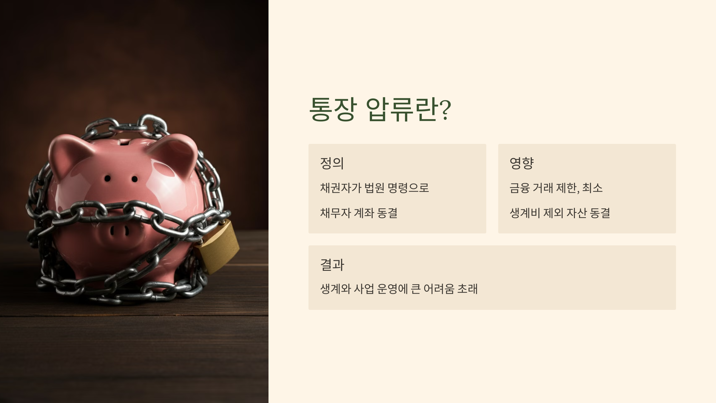 통장 압류란 채권자가 법원의 집행 명령을 통해 채무자의 은행 계좌를 동결하고, 채무 변제를 위한 자금을 확보하는 강제집행 절차입니다.