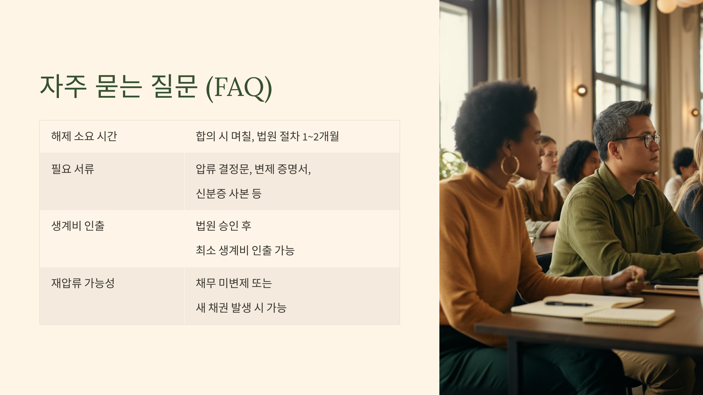 - 재정 점검: 압류 해제 후에도 채무와 재정 상태를 점검하며 재발을 방지합니다.