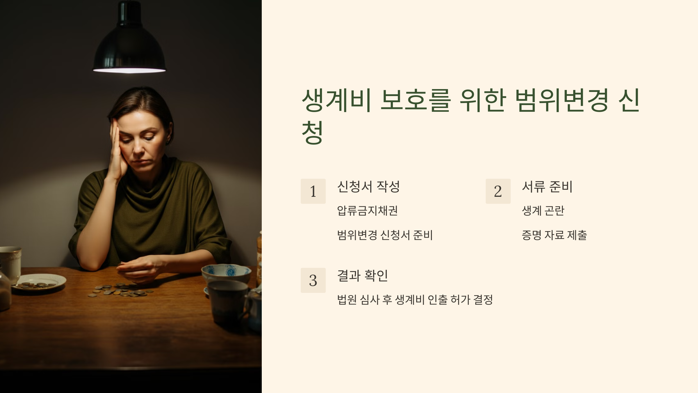 압류된 통장에서도 최소 생계비를 보장받기 위해 압류금지채권 범위변경 신청을 할 수 있습니다.