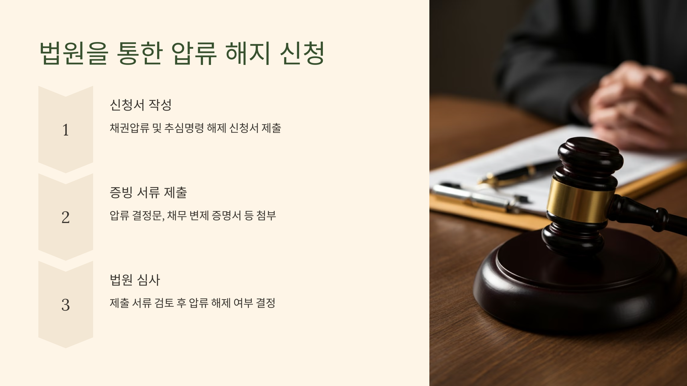 - 법원 심사: 제출된 서류를 법원이 검토한 뒤 압류 해제 여부를 결정합니다.