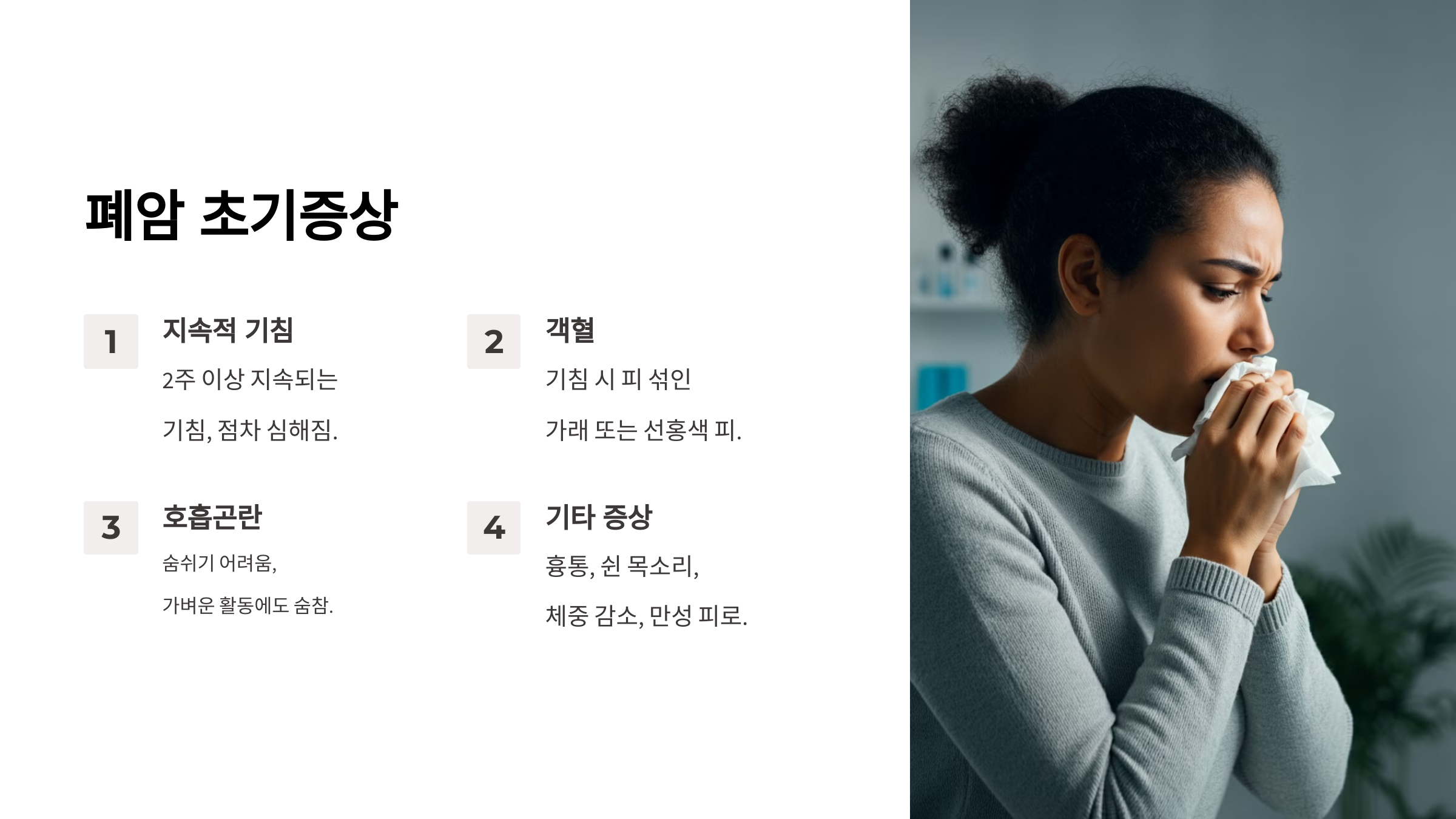 초기 폐암은 증상이 거의 없거나 가벼운 경우가 많습니다. 하지만 다음과 같은 증상이 2주 이상 지속된다면 주의가 필요합니다: