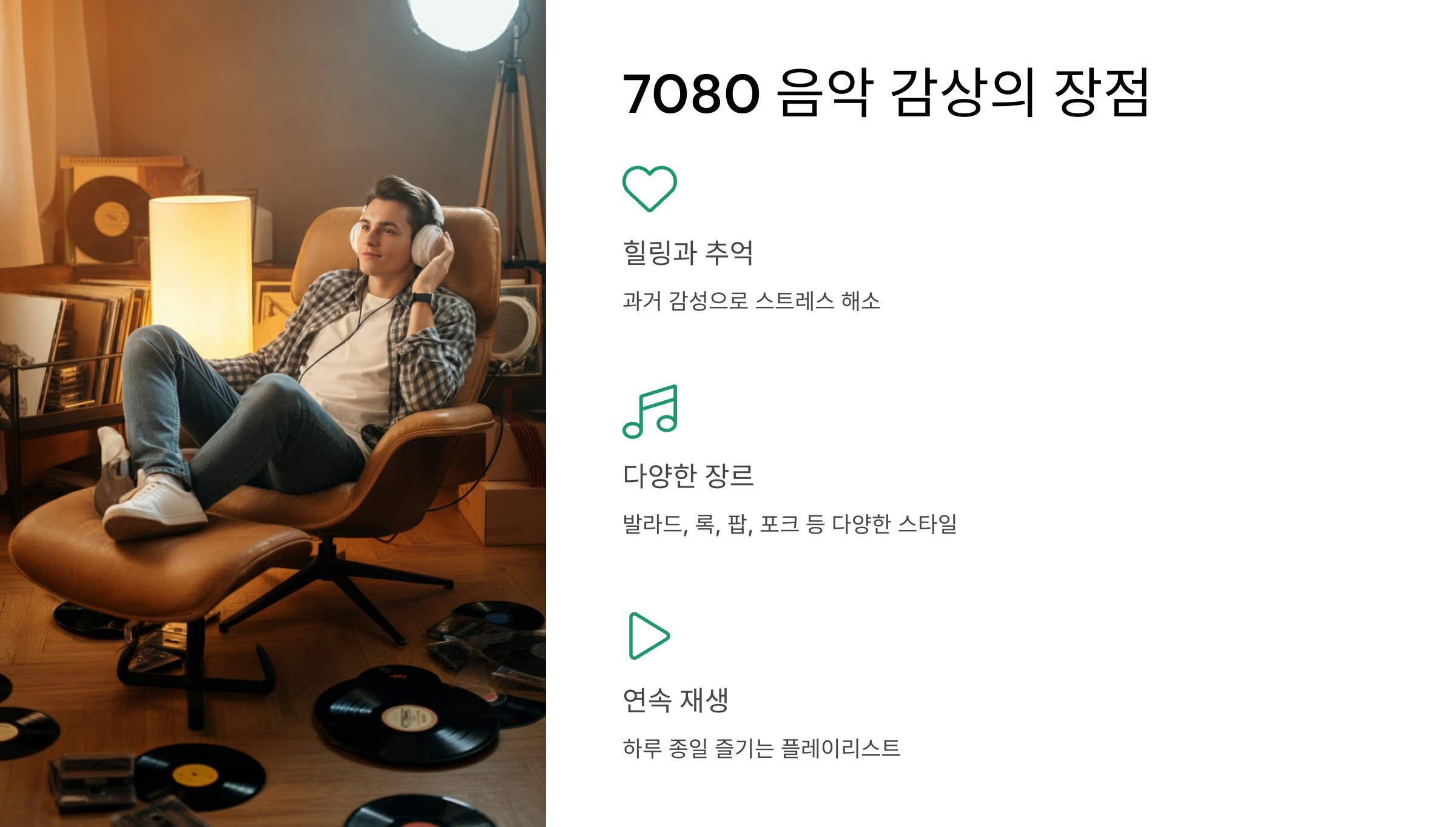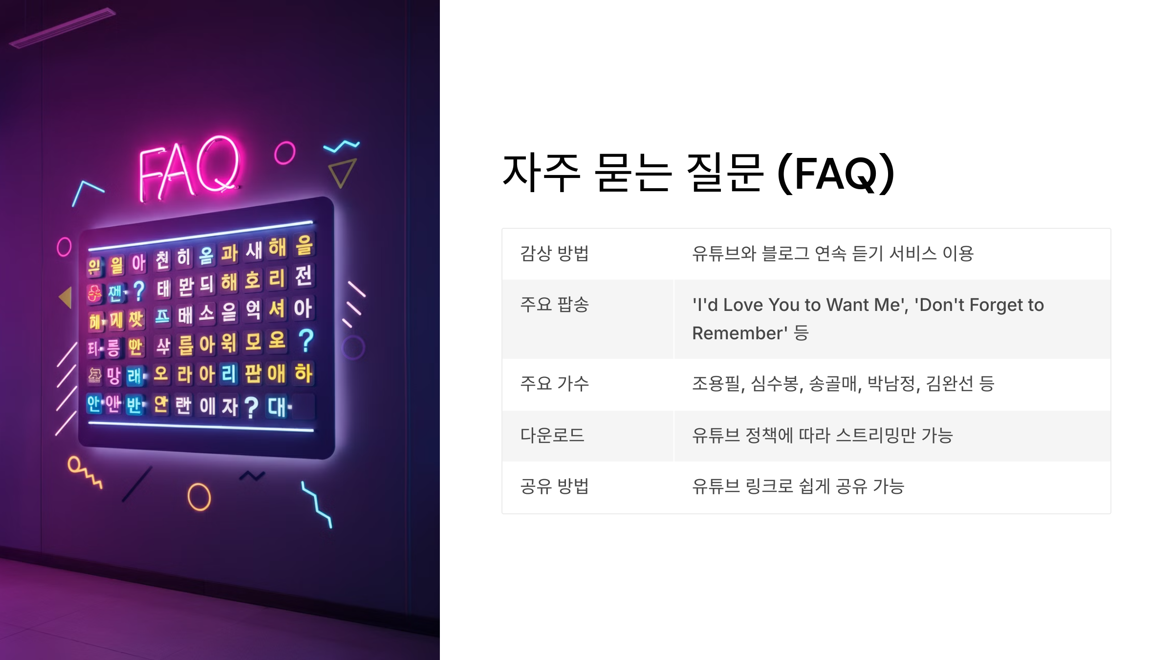 - 연속 재생: 한 번 클릭으로 하루 종일 즐길 수 있는 플레이리스트!