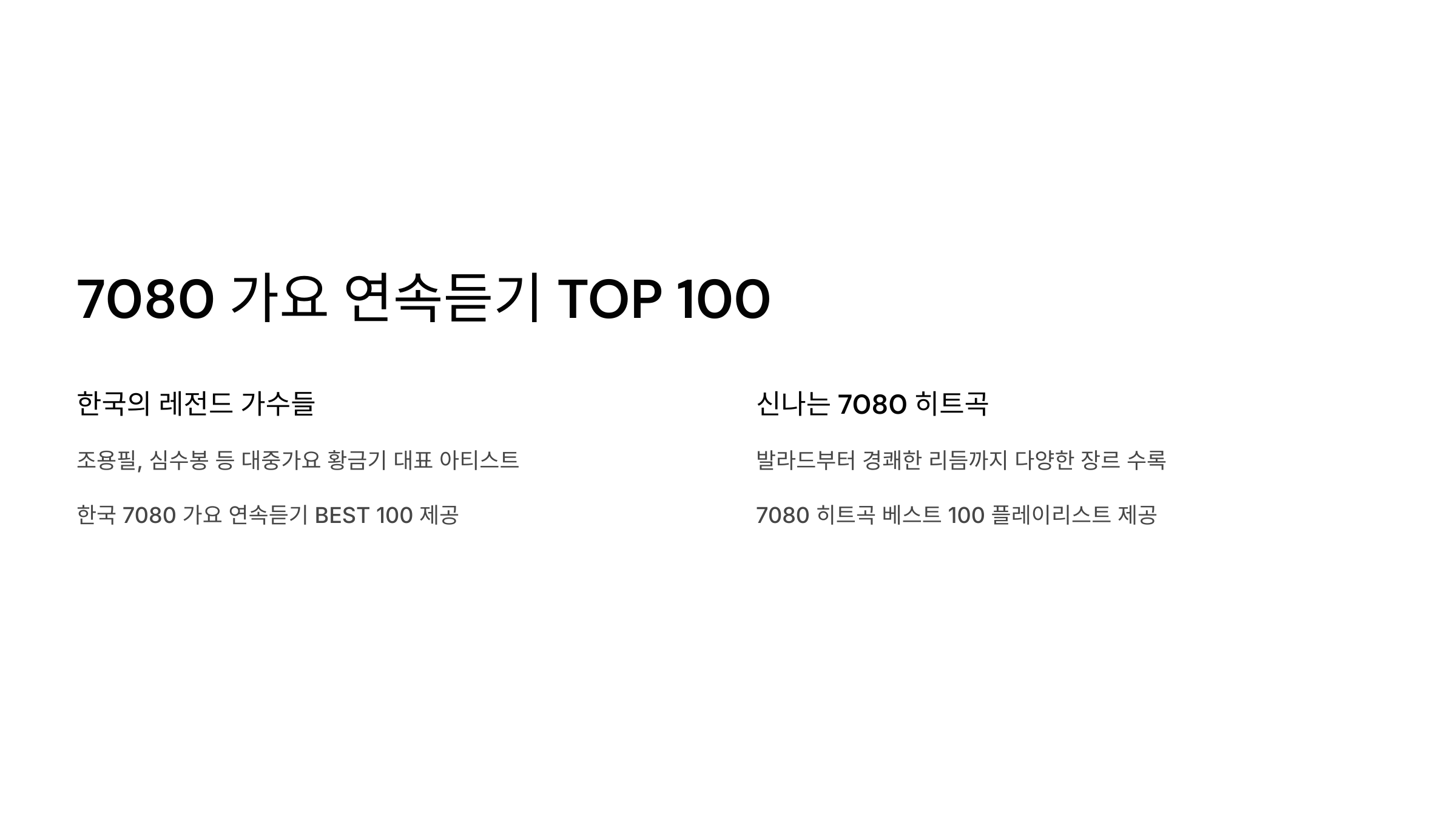 - 발라드부터 경쾌한 리듬의 곡까지 골고루 수록된 7080 가요 모음입니다. 하루 종일 들어도 질리지 않습니다.