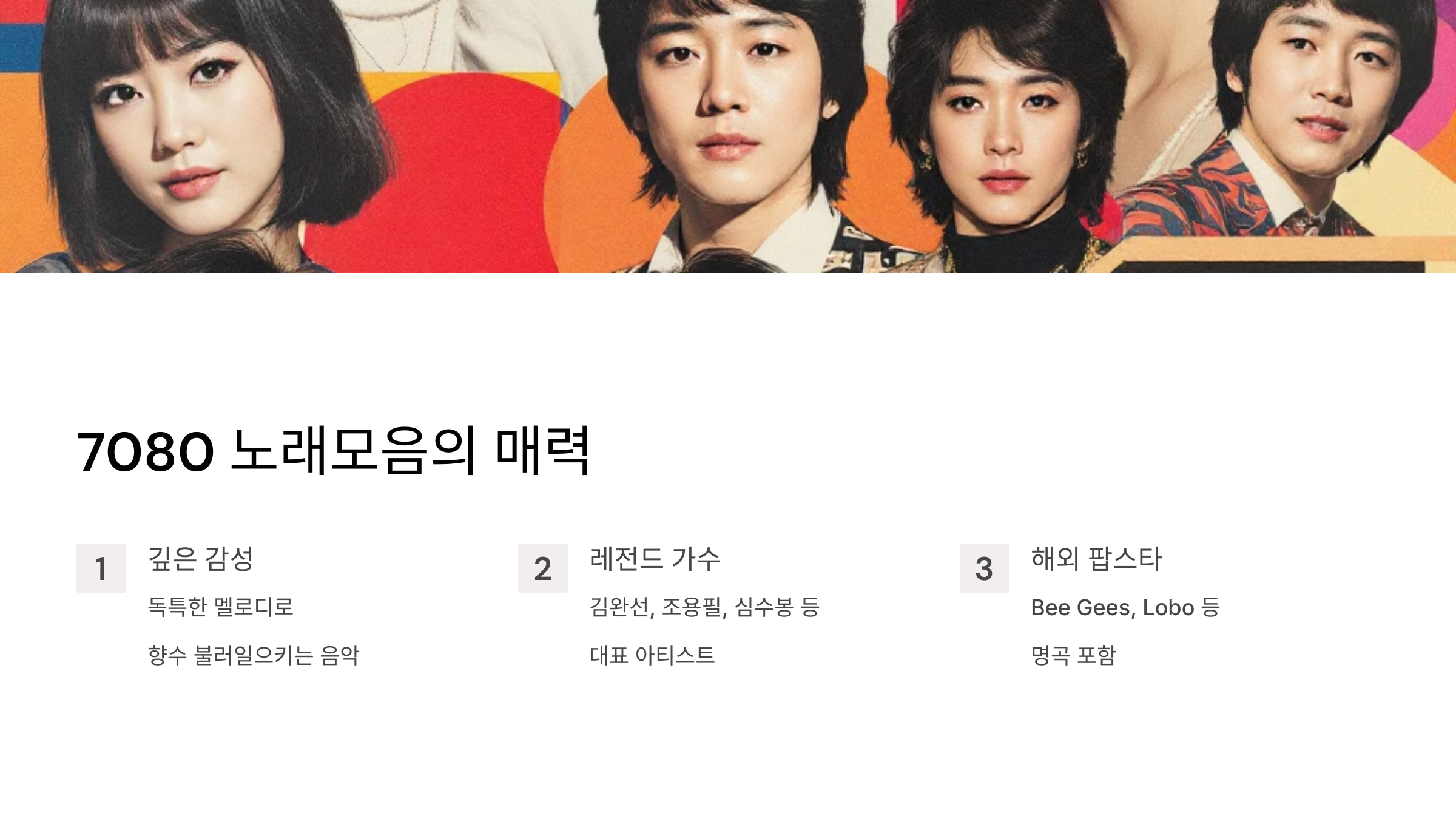 7080 음악은 가요와 팝송 모두 깊은 감성과 독특한 멜로디로 많은 사람들에게 향수를 불러일으킵니다. 김완선, 조용필, 심수봉 등의 레전드 가수들과 함께, Bee Gees, Lobo 등의 해외 팝스타들의 명곡을 들을 수 있는 시대의 대표적인 음악들입니다.
